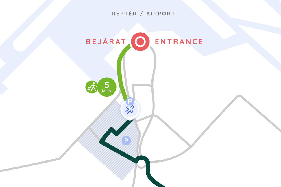 A terminál épületét elhagyva a jelzéseket követve kb. 4-5 perces sétával eléred a Holiday Parkolót, ahol a lefoglalt vagy megrendelt autó a dedikált GreenGo parkolóhelyek egyikén vár.